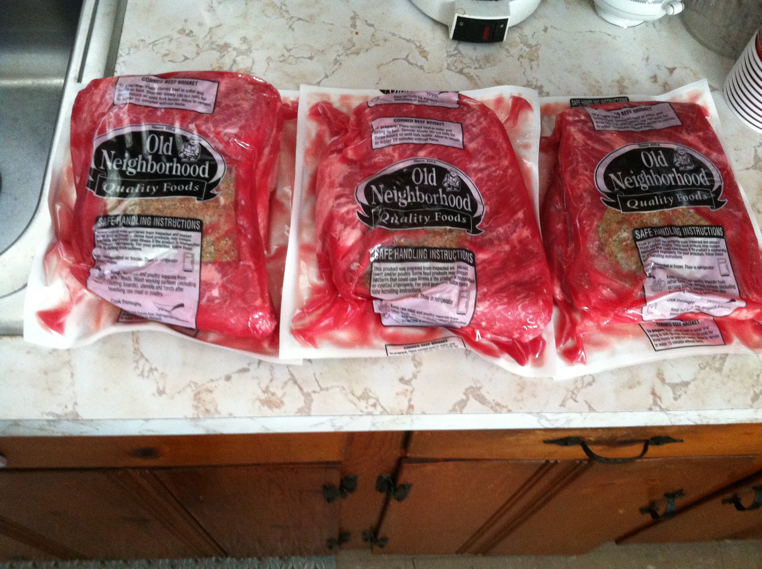 | Three packages of Red Corned Beef. (Corned beef comes in different cuts and colors. This picture is of red color flat cut.) |
